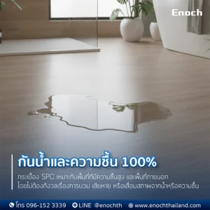 หนึ่งในคุณสมบัติสำคัญที่ทำให้พื้น SPC ได้รับความนิยมคือ กันน้ำได้ 100% เนื่องจากมีส่วนประกอบหลักเป็น Stone + Plastic ทำให้ไม่บวมหรือโก่งตัวเหมือนไม้ลามิเนต