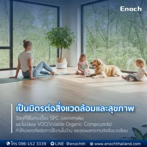 พื้น SPC ผลิตจากวัสดุที่ปลอดภัย ไม่ปล่อยสารระเหยอันตราย (VOC – Volatile Organic Compounds) ทำให้เหมาะสำหรับบ้านที่มีเด็กเล็ก ผู้สูงอายุ หรือสัตว์เลี้ยง