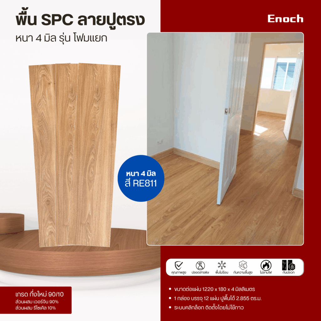 พื้น SPC เกรดโครงการ วัสดุกึ่งใหม่ หนา 4 มม. ลายปูตรง (โฟมแยก) RE811